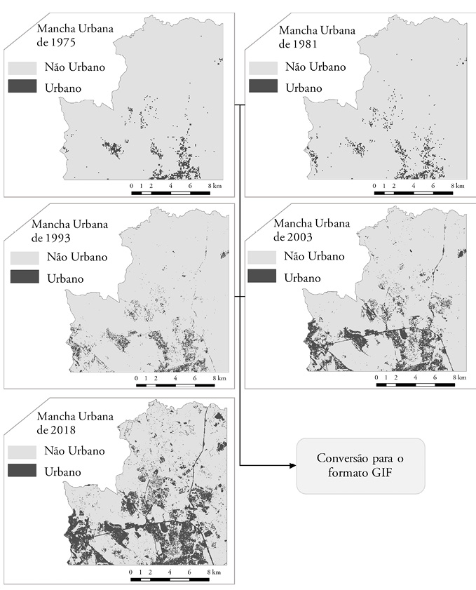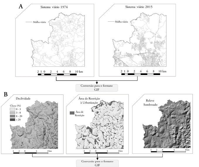Na etapa de entrada de dados, os mapas da malha viária de 1974 e 2015 (Figura 3, painel A), mapas de declividade, relevo sombreado e áreas de restrição (Figura 3, painel B), além dos mapas das manchas urbanas em 1975, 1981, 1993, 2003 e 2018 (Figura 4) foram todos convertidos para gif, com extensão (número de linhas e colunas) e resolução espacial (10m) iguais.