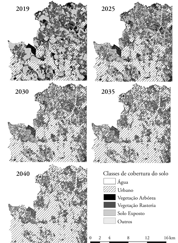 A geração de cenários de predição foi realizada com os valores de coeficientes obtidos para a data mais recente do mapa de uso e ocupação do solo, que no presente estudo se refere ao ano de 2018 e estão apresentados na Tabela 3. Foram produzidos cenários preditivos desde 2019 a 2040, anualmente.