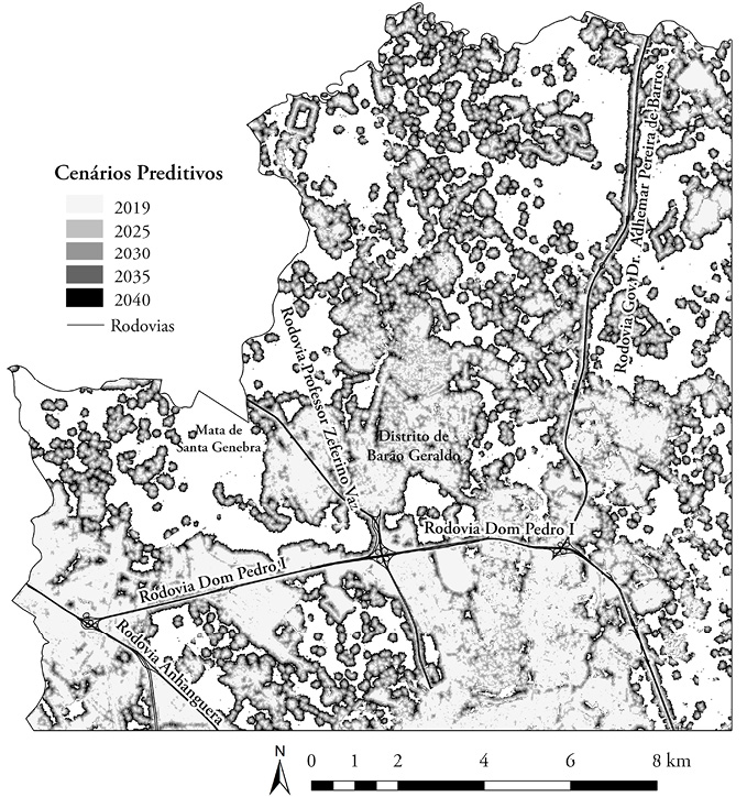 Por outro lado, ao norte da rodovia Dom Pedro I, os cenários de crescimento imdicam um processo de ocupação se expandindo e adensando, a partir do núcleo urbano do distrito de Barão Geraldo, sobre áreas verdes, principalmente a unidade de preservação Mata de Santa Genebra. Assim como se observa o avanço da urbanização nas áreas periurbanas, substituindo áreas com uso rural em 2019. Essa ocupação requer uma atenção dos gestores urbanos, devido a tendência de crescimento sobre áreas de preservação ambiental. Alguns fatores determinates desta tendência, de acordo com os coeficientes de crescimento avaliados pelo modelo foram: relevo favorável à edificação, por predominar áreas com baixa declividade; atração econômica pela presença de pólos tecnológicos e educacionais e estrutura viária.