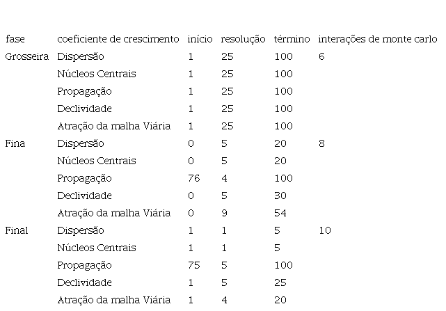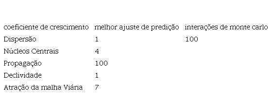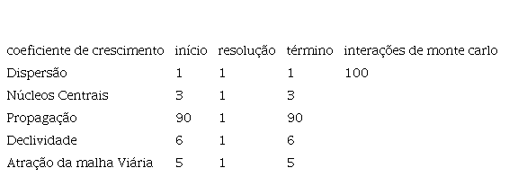 Portanto, os valores dos coeficientes empregados para a calibração do modelo de crescimento da área de estudo do município de Campinas utilizaram as referências apresentadas na Tabela 1.