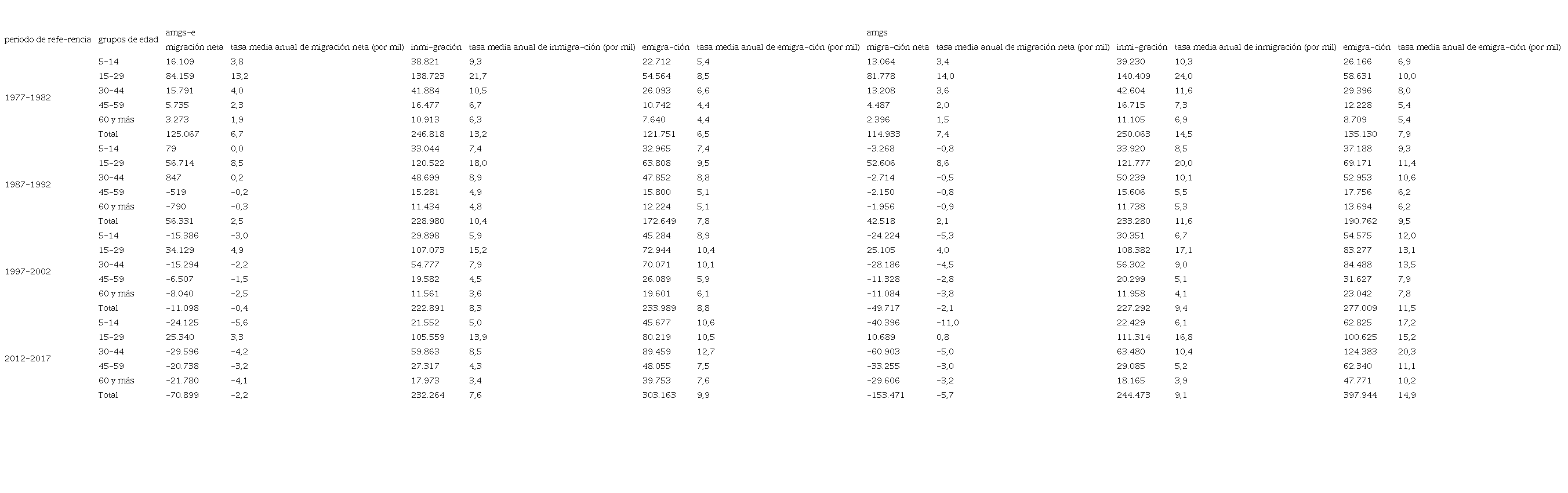 El segundo valor agregado de la tabla proviene de la consideración de la inmigración y la emigración como componentes de la migración neta. Y en este sentido Santiago se distingue de otras ciudades de América Latina, donde la pérdida de atractivo migratorio se ha debido exclusivamente a la baja de la inmigración (Rodríguez-Vignoli, 2019b). En efecto, el amgs-e ha reducido su inmigración fuertemente desde tasas del orden de 13,2 por mil en 1977-1982 a 7,6 en 2012-2017, mientras que la emigración saltó desde 6,5 por mil en 19771982 a 9,9 en 2012-2017. Estos cambios son aún más pronunciados en el amgs, sobre todo en el caso de la emigración, cuya tasa casi se duplica en el periodo de observación (Tabla 1).
