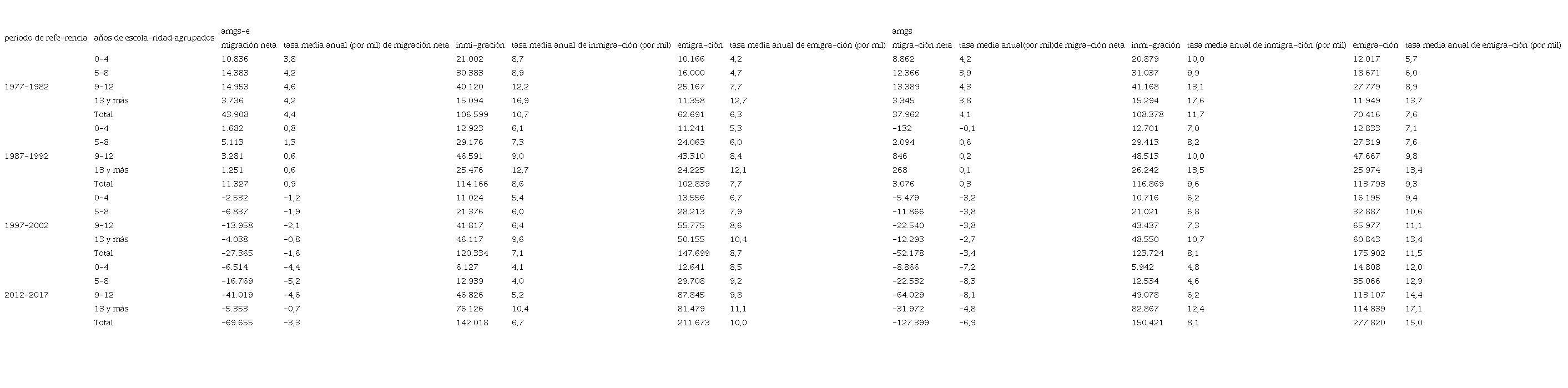 Otro hallazgo es el cambio en la heterogeneidad de las tasas de inmigración y emigración según nivel educativo. En 1977-1982 la tasa de inmigración del grupo de alta educación era el doble de la tasa de inmigración del grupo de baja educación, mientras que ese diferencial era incluso más marcado en el caso de la emigración, pues la tasa de emigración del grupo de alta educación era el triple de la tasa de emigración del grupo de baja educación. En cambio, en 2012-2017 el diferencial se amplió para la tasa de inmigración, por cuanto la del grupo de alta educación era más del doble de la del grupo de baja educación, mientras que en el caso de la tasa de emigración el diferencial se estrechó significativamente, pues la del grupo de alta educación fue solo 50% mayor que la del grupo de baja educación.
