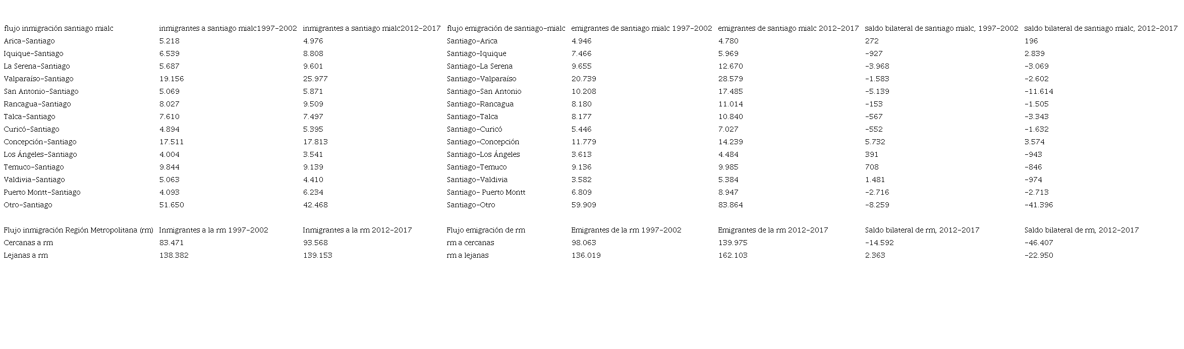 Cabe mencionar que este escenario era diferente a inicios de siglo, pues el Censo 2002 indicaba que Santiago mialc ganaba en los intercambios bilaterales con la mayoría de las otras ciudades y que toda la emigración neta de la rm se explicaba por el intercambio bilateral con las regiones cercanas. En tal sentido, hasta fines del siglo pasado la migración interna podría haber empujado una suerte de “desconcentración concentrada” a gran escala, pero actualmente las cifras sugieren que esta fase ya ha quedado atrás y que la migración promueve una desconcentración demográfica real, aunque de magnitudes muy inferiores a la que se deriva de su emigración neta.