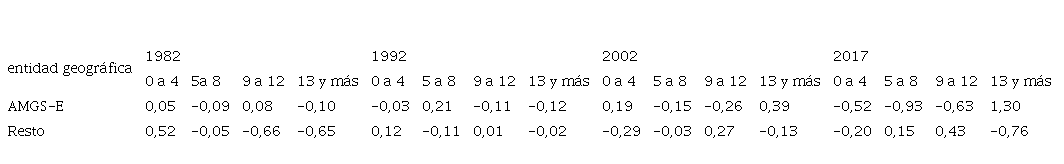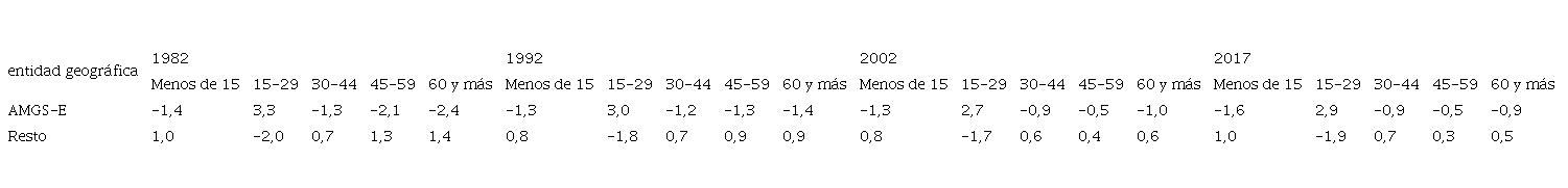 En esa línea, los resultados de la Tabla 4 no son sorpresivos, pues se podían prever a partir del mayor atractivo del amgs-e para los jóvenes en el Censo 1982, junto con el contrapunto entre el amgs-e atractiva para los jóvenes y expulsora para el resto de las edades que revelaron los censos de 1992, 2002 y 2017 (Tabla 1). La novedad estriba en la estimación numérica del efecto. Llamativamente, este ha sido más bien constante durante el periodo de observación, pese a la significativa merma de la intensidad del atractivo migratorio del amgs-e para todas las edades.5 De esta manera, en los últimos cuarenta años, la migración ha aumentado el porcentaje de jóvenes del amgs-e en torno a un 3%6 en cinco años (periodos de referencia de la migración en cada censo) y ha visto reducido el porcentaje de los otros grupos de edad entre un 1% y un 2,5%, dependiendo del grupo y el periodo de referencia (o censo).
