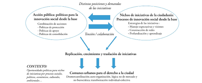 Las iniciativas de producción de comunes urbanos presentarían así las características de procesos de innovación social desde la base: prefiguran y construyen alternativas; operan en un primer momento de forma paralela y alternativa a las formas hegemónicas de gestión y acceso a bienes y servicios; y aspiran a transformar los sistemas. Esta literatura ofrece elementos para aproximarnos a aquellos caminos por los cuales iniciativas de innovación de base encuentran oportunidades para cambiar los sistemas dominantes; a las estrategias que desarrollan; y a la forma en que buscan crecer y consolidarse (Seyfang & Haxeltine, 2012).