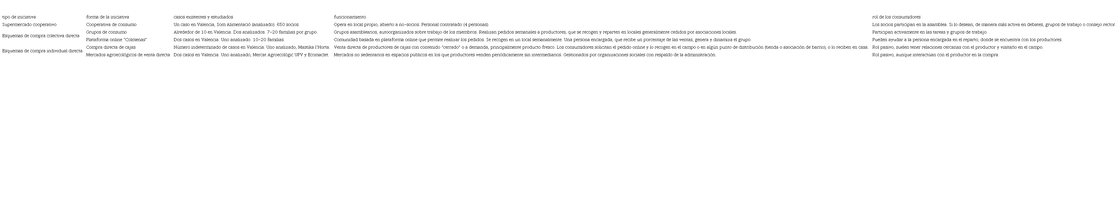 En el caso de Valencia, se ha incrementado recientemente el número de iniciativas de canales alternativos de producción, distribución y consumo alimentarios, que han ganado madurez y visibilidad (véase, por ejemplo, Moragues-Faus, 2017). Estas iniciativas plantean formas y estrategias distintas, pero se basarían en principios comunes, como los señalados: sostenibilidad, agroecología, relocalización de sistemas, apoyo a la agricultura familiar, revitalización de espacios urbanos o periurbanos (Pellicer-Sifres et al., 2017). Todas se abastecen principalmente de producciones de agricultores o cooperativas agroecológicos del área periurbana de Valencia. Se ha analizado una muestra de iniciativas que pretende capturar esta diversidad, cuyas principales características se exponen en la Tabla 1.