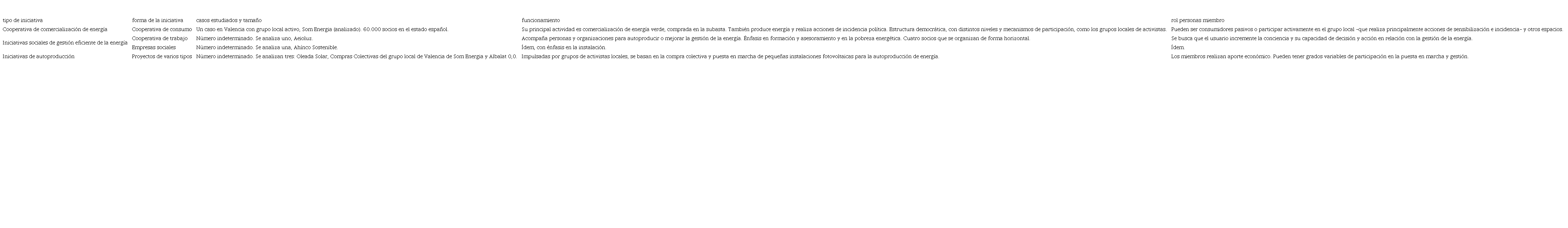 En la investigación se ha abordado casos en Valencia que, moviéndose en los márgenes que permite la normativa, tratan de generar un modelo alternativo, más democrático y sostenible de producción, distribución y consumo de energía. En la Tabla 2 se describen estos casos, que presentan gran diversidad.