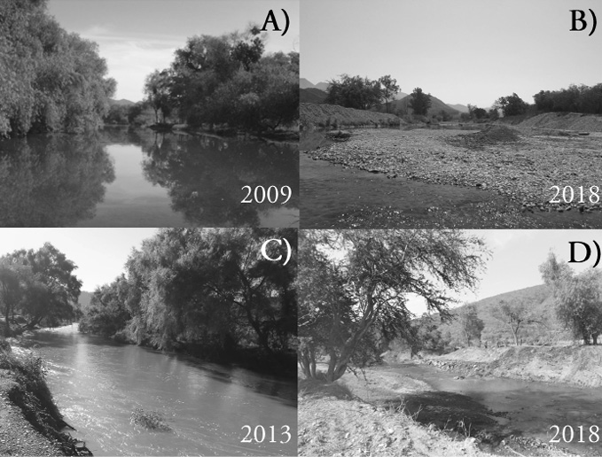 a) y b) junto al vado, años 2009 y 2018; c) y d) frente al parque alameda 2, años 2013 y 2018. se puede observar la pérdida del bosque de ribera y la modificación del cauce como consecuencia del dragado y construcción de un puente y bordos.