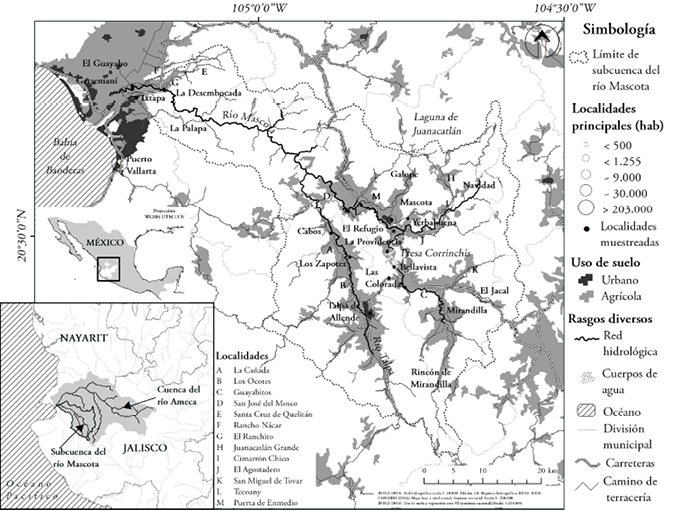 La subcuenca hidrológica del río Mascota (2132 km2) se localiza al occidente del estado de Jalisco, México; pertenece a la cuenca del río Ameca (Figura 1). Su población total (55.662 habitantes) se concentra principalmente en tres localidades: Ixtapa, Mascota y Talpa de Allende (84%); el restante, en 206 (<2.500 habitantes) (Instituto Nacional de Estadística y Geografía [inegi], 2010). Las actividades económicas predominantes son agricultura,4 ganadería extensiva y explotación forestal (Instituto de Información Estadística y Geográfica [iieg] Jalisco, 2017). Su red hidrológica y cuerpos de agua favorecen la pesca artesanal a lo largo del río Mascota (corriente principal), afluentes y cuerpos de agua naturales (lagunas de: Juanacatlán, Yerbabuena y Potrerillos) y en el embalse artificial Presa Corrinchis, construido durante 1974-1977 con fines de riego agrícola. El proceso de antropización de la región está relacionado al cambio de uso de suelo (Instituto Nacional de Ecología y Cambio Climático [inecc]-Fondo Noroeste [fonnor], 2018) y acelerada expansión urbana, principalmente en la parte baja (Baños Francia, 2018).