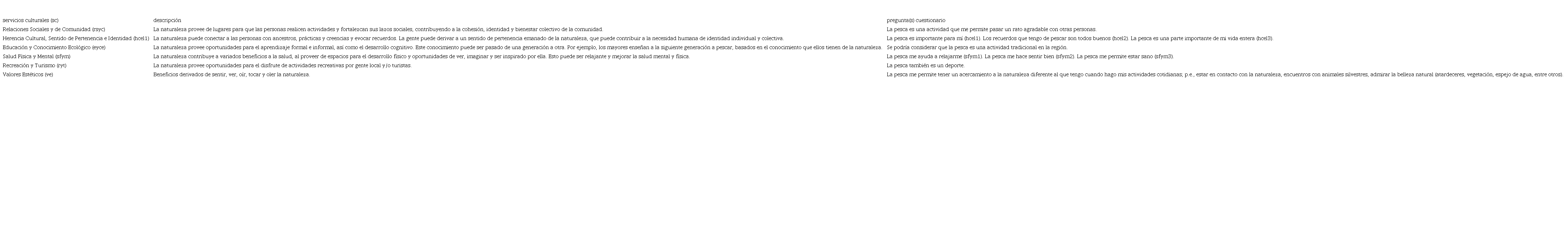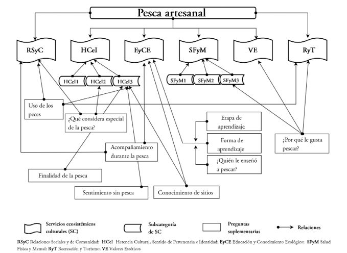 Su valoración directa se realizó con preguntas en escala Likert (Likert, 1932), asignando puntajes 1-5: totalmente en desacuerdo (1), en desacuerdo (2), neutral (3), de acuerdo (4), totalmente de acuerdo (5) (Rodrigues, 2015). Se consideró que el pescador identificó un sc cuando asignó puntajes de 4 y 5. Cuatro sc se evaluaron mediante una pregunta (rsyc, eyce, ryt y ve), mientras que los servicios restantes se abordaron con tres, debido a su complejidad (hcei y sfym). La valoración de sc con más de una pregunta se estableció mediante la media aritmética.