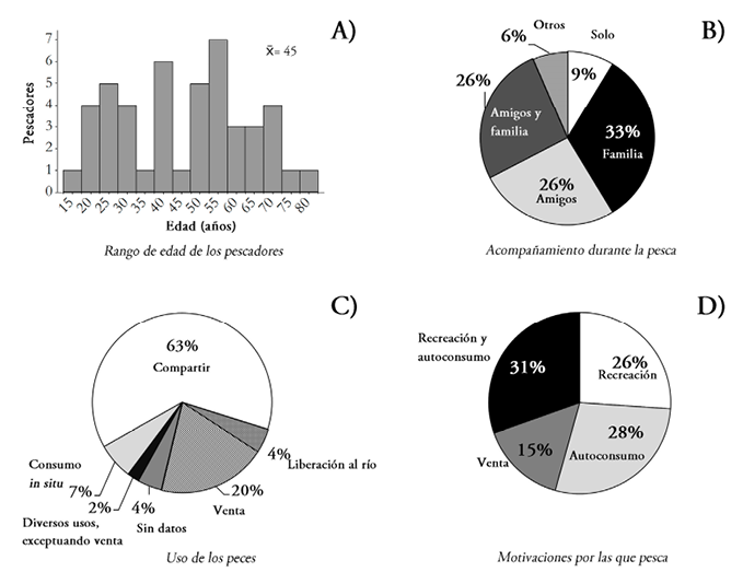 nota: a) edad de los pescadores, b) acompañamiento durante las actividades de pesca, c) uso de los peces, y d) motivaciones para pescar.