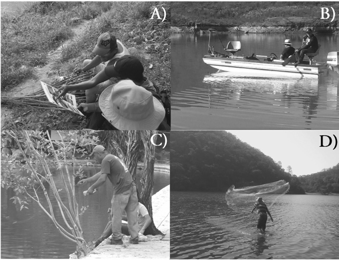 elaboración propianota: a) pescador de la desembocada construyendo una nasa mientras identifica las especies objetivo de la pesca durante la entrevista; b) pescadores deportivos participando en torneo de pesca en la presa corrinchis; c) padre e hijo pescando con piola en la laguna de yerbabuena; d) pescador empleando atarraya, laguna de juanacatlán.