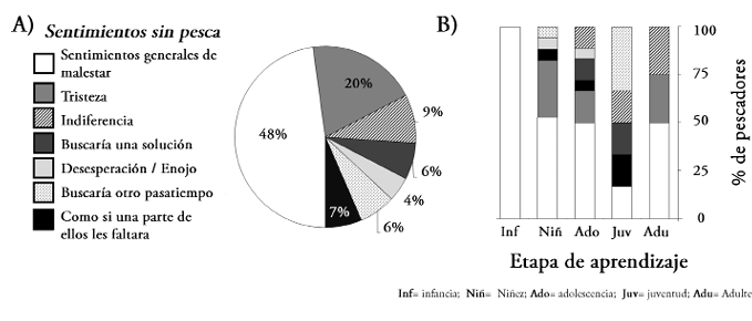 Estos afectos fueron más representativos de quienes aprendieron en etapas tempranas, mientras que la proporción de pescadores indiferentes o que buscarían otro pasatiempo fue mayor en aquellos que lo hicieron durante la juventud y adultez (Figura 5B).
