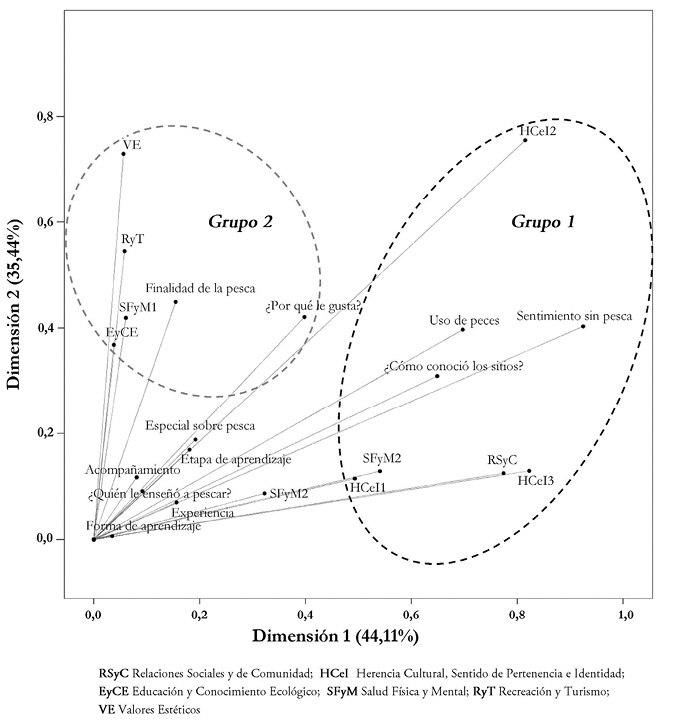 elaboración propiaEl análisis de correspondencias múltiples mostró la existencia de dos grupos de sc (Figura 6). En el primero se asociaron las variables de sentimiento sin pesca, uso de los peces y conocimiento de los sitios de pesca, las cuales están agrupadas dentro de los servicios culturales de hcei y rsyc (Figura 2). Este grupo fue catalogado como Comunitario, debido a que está relacionado a valores colectivos y lazos sociales. En el segundo se relacionaron las variables de finalidad de la pesca y por qué les gusta pescar, que se agrupan en los servicios ecosistémicos culturales ve [Valores Estéticos], ryt [Recreación y Turismo], sfym2 [Salud Física y Mental 2] y eyce [Educación y Conocimiento Ecológico]. A este último grupo se le denominó Individual, debido a que estos beneficios resultan de la interacción personal con la actividad.