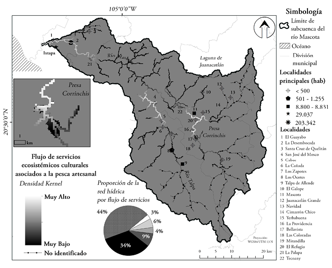 El análisis Kernel estimó que el flujo de sc ocurre en 66% de la red hidrológica y cuerpos de agua, de los cuales 13% registró categorías de medio a muy alto. Se identificaron tres zonas principales de flujo de sc: i) Presa Corrinchis-río Mascota, ii) Desembocadura río Mascota-La Palapa, y iii) San José del Mosco-Los Zapotes (Figura 7). Los ríos de las partes altas de la subcuenca, antes de los poblados de Talpa, Mirandillas y Cimarrón Chico, no fueron identificados como sitios de pesca.