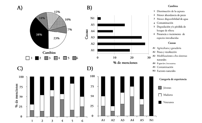 a) https://bit.ly/2vm3hu8; b-d) primera autora, eréndira canales-gómezLos pescadores más experimentados identificaron cambios observables a largo plazo (disminución de capturas y de abundancia de peces, presencia de especies invasoras), mientras que los jóvenes mencionaron afectaciones más recientes (merma en la disponibilidad de agua, contaminación) (p=0,00) (Figura 8C). Los maduros notaron en mayor proporción la degradación y/o pérdida del bosque de ribera (p=0,00). Los factores referidos fueron similares entre jóvenes y maduros, principalmente los efectos de especies introducidas y alteraciones a los sistemas naturales (Figura 8D) (p= 0,334). Por su parte, los veteranos consideraron como principales causas las malas prácticas pesqueras y efectos derivados de la agricultura y ganadería (p=0,00).