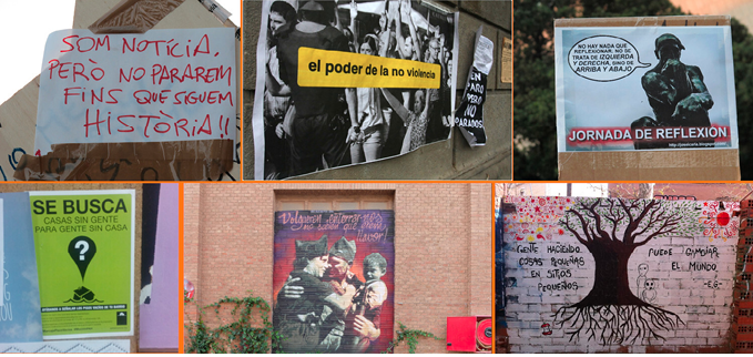 En su mayoría, los casos analizados nacen del descontento con alguna situación, normalmente con respecto a determinadas políticas o efectos derivados de ellas (como, por ejemplo, la gentrificación o la privatización del espacio público) o con la propuesta de acciones consideradas “más justas”. Tanto es así, que uno de los aspectos que caracteriza a todos los comunes urbanos es que implican siempre una forma de resistencia o reivindicación. Otro aspecto característico es que esa clara vocación reivindicativa no se limita únicamente a la denuncia, sino que, lejos de conformarse con lo que consideran carencias o problemas, las comunidades involucradas se organizan cooperativamente para proponer alternativas y llevarlas a cabo, incluso aunque eso implique acciones de desobediencia civil. Este empoderamiento ciudadano, amparado en la legitimidad de sus reivindicaciones, pone en evidencia las debilidades del capitalismo y, concretamente, del urbanismo neoliberal, cuyo modus operandi se basa en procesos de cercamiento de todo tipo (Hodkinson, 2012, p. 506). En este sentido, los comunes urbanos pueden entenderse como movimientos políticos, sin que eso signifique que estén directamente vinculados con partidos políticos de ningún tipo. Esto es algo que se percibe desde el primer momento en el que se tiene acceso a cualquiera de los comunes, sea por la presencia de carteles o murales reivindicativos (Figura 1), por el lenguaje utilizado en las comunicaciones, o por la temática de las actuaciones que organizan.