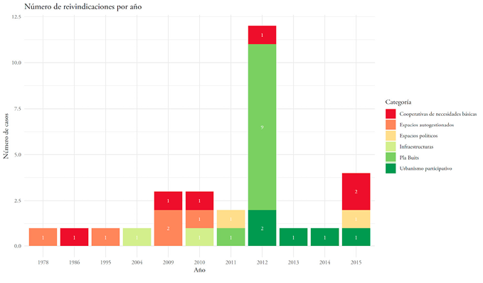 Por último, cabe señalar que las reivindicaciones van transformándose y adaptándose con el transcurrir del tiempo: lo que empieza como reivindicaciones más o menos difusas o generales sobre especulación inmobiliaria, vacíos urbanos, participación ciudadana o economía social, poco a poco se va concretando y acotando más, especialmente a partir del 15m de 2011. Adicionalmente se observa una tendencia de cambio en la tipología de casos, siendo la más evidente el hecho de que iniciativas de centros autogestionados (muy propias de los movimientos sociales) van dando paso a iniciativas de urbanismo participativo.