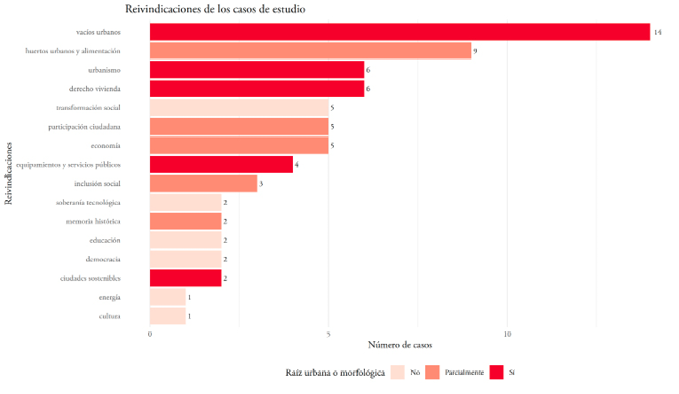 Con respecto a las reivindicaciones de los casos estudiados, la Figura 3 muestra una serie de temas que son relativamente frecuentes. Los más evidentes son la utilización de vacíos urbanos y la realización de huertos urbanos, seguidos de las reivindicaciones relativas al derecho a la vivienda, la transformación social, la participación ciudadana y la economía. Otras reivindicaciones que también se repiten, aunque en menor medida, son las relativas a los equipamientos y servicios públicos, la inclusión social, la soberanía tecnológica, la sostenibilidad, la educación y la democracia.