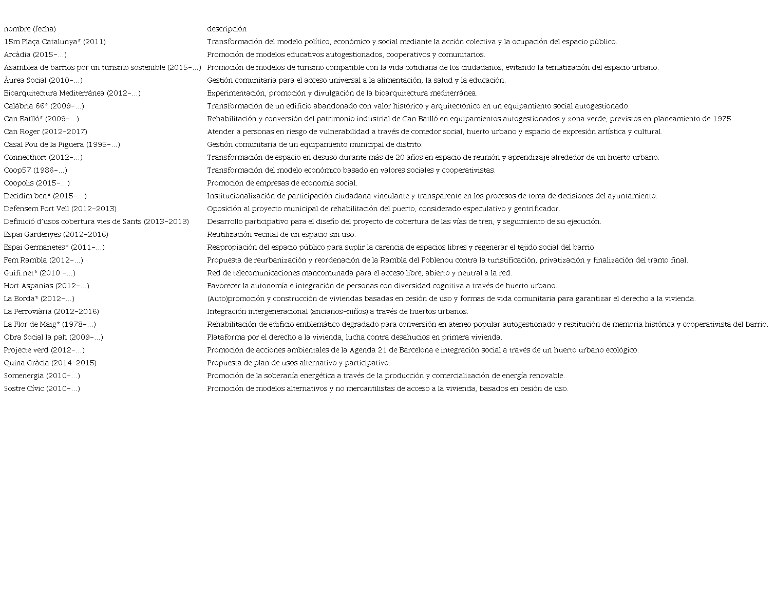 Durante 2011 y 2016 se rastrearon numerosas luchas vecinales que se producían en la ciudad y que tenían como común denominador la acción colectiva y la búsqueda de transformación social y urbana. De las 54 iniciativas identificadas en esta fase previa, se seleccionaron 28 casos (Tabla 1) que debían cumplir dos características. En primer lugar, debían articularse alrededor del concepto de “comunes urbanos” de forma explícita, ya fuese por sus propios impulsores o por autores independientes (Harvey, 2012/2013; Observatori Metropolità de Barcelona, 2014). En segundo lugar debían encajar dentro de alguna de las conceptualizaciones de los comunes urbanos presentadas en la sección anterior. Posteriormente, se combinaron dos métodos distintos para obtener un conocimiento profundo del fenómeno de los comunes urbanos en Barcelona. Por un lado, se procedió a realizar una codificación sistematizada de las características principales, motivaciones y mecanismos de funcionamiento de la totalidad de los 28 casos de estudio a través de una revisión bibliográfica de noticias, publicaciones y webs de las propias iniciativas, resultando en una matriz con más de 50 variables, tales como la fecha de creación, la temática, el tipo de reivindicaciones, la forma jurídica, tipo de gobernanza, entre otras. Por el otro, y de forma paralela, se realizó un proceso etnográfico durante los años 2012 y 2017 de los ocho casos más relevantes,1 a partir de observaciones participantes en asambleas y encuentros, así como de entrevistas a informantes clave.