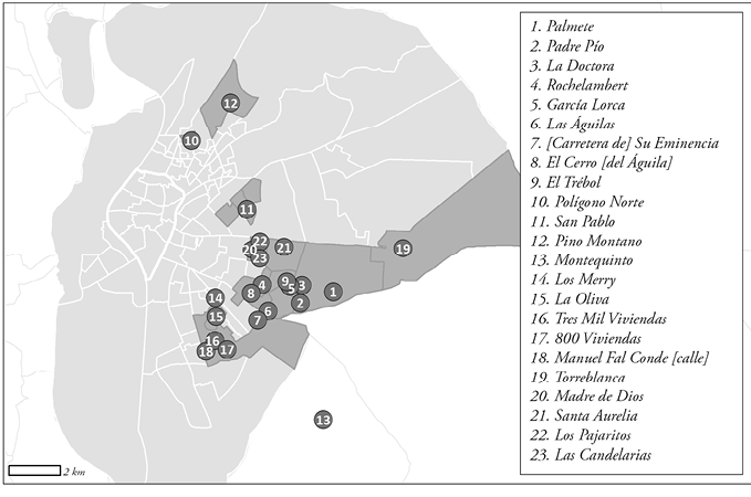 También desde una perspectiva geográfica y espacial el flamenco se ha situado en los márgenes, cualquiera que sea la escala de interpretación territorial. Partiendo de un ámbito más general, esta música, al proceder de regiones periféricas del “Sur” –Andalucía, pero también la Extremadura más meridional o la comarca minera de Cartagena y La Unión, en Murcia– arrastra todas las connotaciones culturales y económicas que ello implica frente a la posición dominante que ostentan las regiones españolas “centrales” (Cruces Roldán, 2003). Y en una escala de mayor detalle, en los ámbitos urbanos y metropolitanos, el flamenco, ya desde su origen, se ha preservado y perpetuado en los arrabales históricos y con posterioridad en barriadas obreras y en polígonos residenciales de las grandes aglomeraciones urbanas españolas,1 amparado en los estrechos círculos asociativos que se originan en torno a la familia, la vecindad y la comunidad (Cruces Roldán, 2002). Serán precisamente estos espacios los más interesantes desde la perspectiva que adoptamos en esta contribución, que al fin y al cabo pretende examinar la forma en que ciertas manifestaciones flamencas producen y reproducen una imagen y un discurso deliberado en torno a determinados territorios urbanos en la frontera.