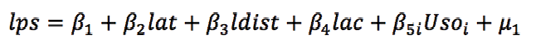 El rápido y desbordado crecimiento poblacional de Bogotá generó una fuerte demanda de localización residencial y, con ella, económica. La respuesta de la administración fue permitir cambios y expansión de usos del suelo dentro del perímetro urbano y cambios en la clasificación del suelo para ofertar suelo a los hogares de bajos ingresos. Estas decisiones implicaron el desbordamiento de la ciudad sobre centros urbanos menores, como Usaquén, Suba, Engativá, Fontibón y Usme. Lo relevante de estas decisiones es su efecto sobre las expectativas del mercado de suelo rural en la frontera de las ciudades. Para tal efecto, se estimó por medio de Mínimos Cuadrados Ordinarios el logaritmo del precio del metro cuadrado de suelo rural (lps) en función del área del terreno (lat), de la distancia al perímetro urbano (ldist), del área construida (lac) y de los distintos usos del suelo (Usoi), como se señala en la siguiente ecuación: