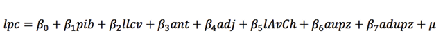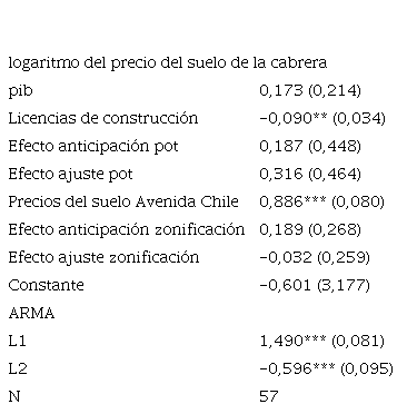 en donde los precios de La Cabrera (lpc) son función de la actividad económica (pib); de las licencias de edificación en vivienda (llcv); de una variable de anticipación de la expedición del Plan de Ordenamiento Territorial (pot) (ant), que toma valores de 0,3 en el año 1998, de 0,6 en 1999, de 0,9 en el año 2000 y 1 en años posteriores; del ajuste a la norma del pot en general (adj), variable de escalamiento 0,25, -0,5, -0,75 y 1 en un periodo de cuatro años; de los precios del centro económico más cercano, Avenida Chile (lAvCh); y de la zonificación de la Unidad de Planeamiento Zonal (upz) en particular (aupz y adupz) expedida en el año 2010 para esa zona. En este último caso, el periodo de anticipación (aupz) y de ajuste (adupz) es solo de tres años. El término de perturbación sigue un proceso arma que captura los comportamientos de los propietarios en el pasado y su respuesta a shocks en este mercado: