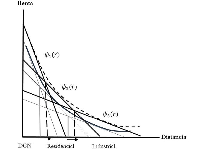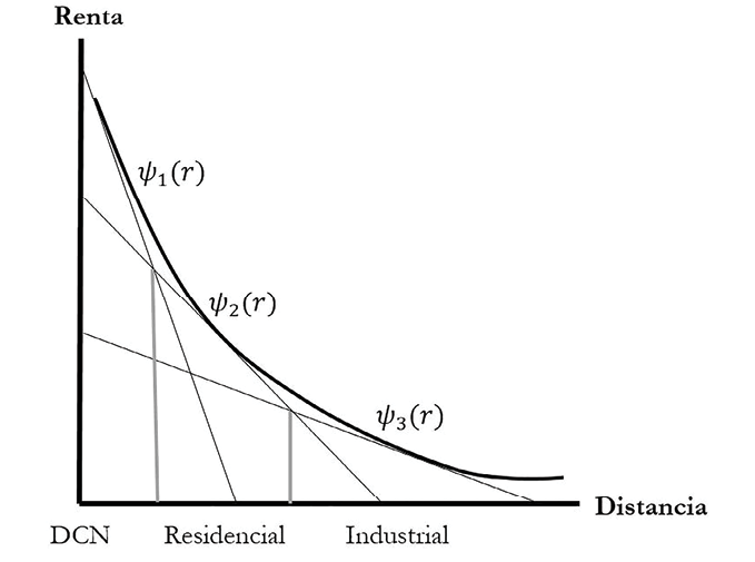 en donde R(r) es la renta por unidad de suelo prevaleciente en la distancia r. El beneficio obtenido por la actividad i en r, en el margen es cero. Es decir, la renta ofertada es la renta de mercado. Nótese que en cada actividad económica se tienen infinitos productores cuyos márgenes son distintos, de manera que se configura un gradiente de rentas por cada una de las actividades urbanas, como se aprecia en la Figura 1.