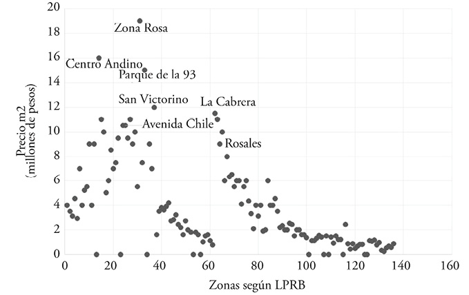 Al observar la dinámica de precios de la ciudad, se puede sugerir que la configuración de la misma es determinada por el mercado, mientras el planeamiento urbano tiene menor fuerza en su configuración. El conteo de Zonas de la lprb indica un crecimiento sostenido del mercado inmobiliario y la expansión del Distrito Central de negocios y de los centros complementarios. En otras palabras, mientras en 1960 la lprb dividía la ciudad en 24 zonas para determinar los precios del suelo, para 2016 se tenían 125 zonas, lo que muestra cómo el mercado de suelo se ha acelerado en el tiempo; en particular, el incremento de 31 zonas entre 1987 y 1988 no tiene equivalente en nada anterior. Ese año, los avaluadores de la lprb reconocieron la importancia de la expansión del centro tradicional hacia el norte por la Carrera 11 desde la Calle 73 a la Calle 100 y en la zona de Ciudad Salitre, un ejemplo de las presiones de precios originadas en las demandas de localización en la ciudad.