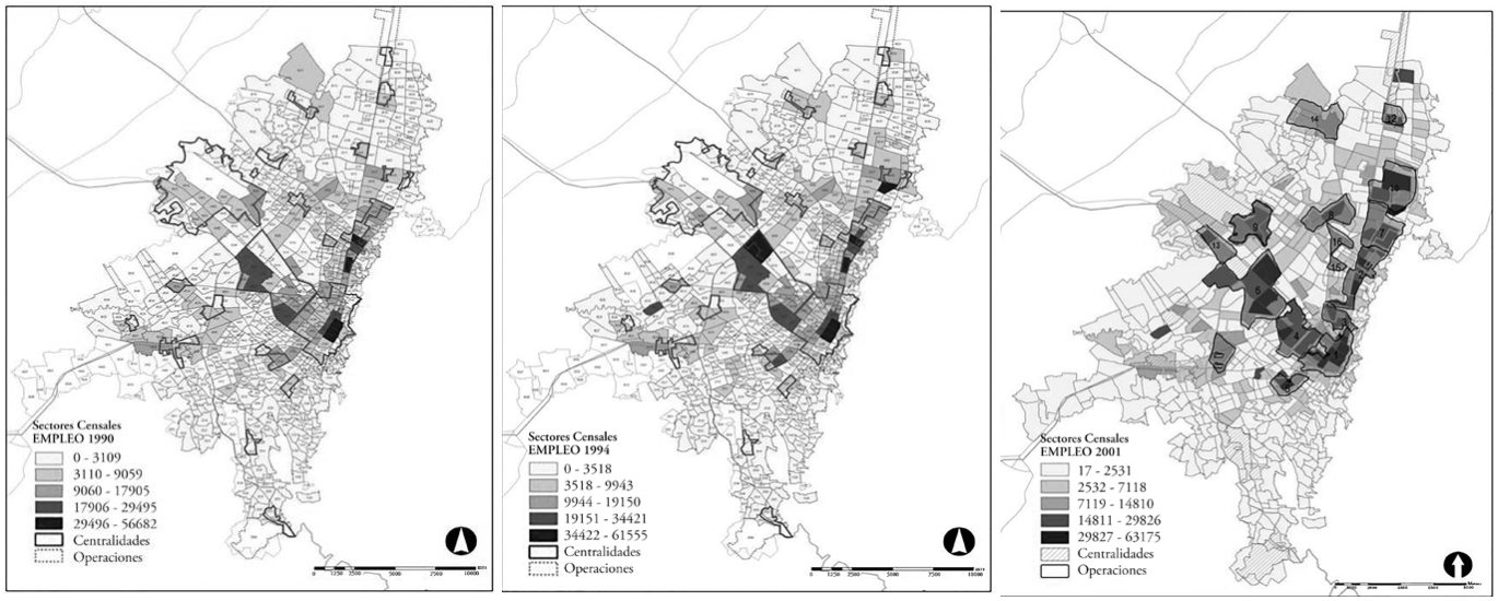 Un segundo hecho en que incide la relación teoría, mercado y práctica urbanística, es la localización del empleo. En los mapas de la Figura 4 aparecen las centralidades y las operaciones estratégicas del Decreto 190 de 2004. Esta figura muestra un proceso de consolidación, saturación y expansión de los centros de empleo en la ciudad. La actividad económica llena los intersticios dejados por las edificaciones residenciales, ocupa aquellos espacios y satura las periferias de los centros existentes, presionando su expansión. Dos ejemplos permiten asociar las presiones al cambio de uso: Quinta Paredes y La Castellana, sectores con origen residencial, pero donde las presiones de localización de hoteles, servicios financieros y servicios comerciales erradicaron el uso residencial en gran parte de ellos.