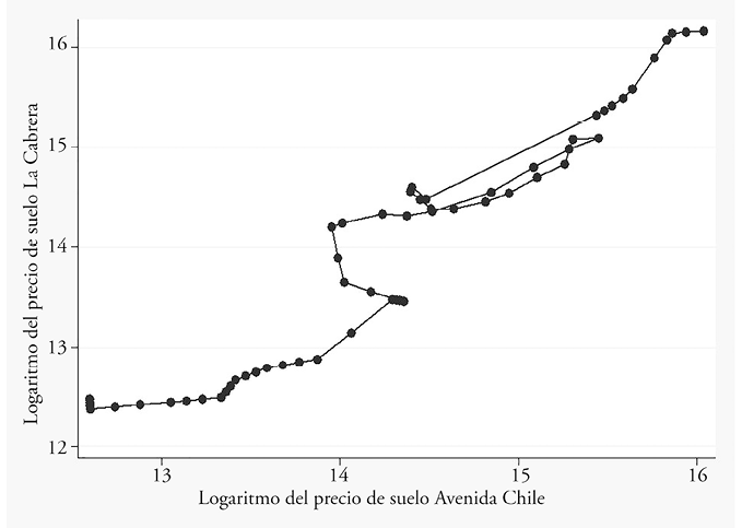 En la figura también se aprecia cómo en algunos momentos del tiempo, en la década de los sesenta, la asociación mostraba un crecimiento apenas notable en la Avenida Chile y una respuesta marginal en La Cabrera. En los ochenta, la dinámica de precios se acelera y comparten la misma evolución. Juntas crecen, la Avenida Chile un poco más, y en periodos de crisis marcados por depresiones económicas también retroceden. En el periodo final de la muestra, los precios han tenido un crecimiento sostenido, pero La Cabrera ha acelerado su crecimiento, lo que puede significar la expansión del centro a áreas mayores a las ya consideradas. Los resultados sugieren que los precios de la Avenida Chile causan los precios de La Cabrera en el sentido de Granger. No hay evidencia de causalidad de precios de La Cabrera a la Avenida Chile. Lo anterior permite argumentar que el comportamiento de los precios es como lo explica la teoría de la renta del suelo ofertada: presiones de demanda sobre la estructura urbana, alzas de precios en el dcn, que se expanden al resto de las zonas de la ciudad.
