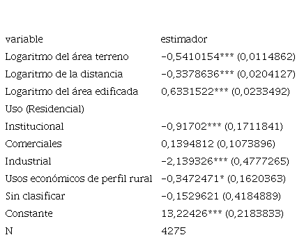 En la Tabla 1, los resultados del modelo indican que los predios de gran magnitud tienen precios menores. Esto es adecuado en virtud de que el loteamiento incrementa el precio del suelo. Respecto de la distancia, se tiene que, al alejarse del perímetro urbano en un 100%, el precio por metro cuadrado se reduce en cerca de 33,7%. De otra parte, si el predio tiene área construida, su precio se incrementará notablemente con áreas edificadas mayores. Para la variable uso, donde el residencial es la base de referencia para la estimación, todos los usos tienen menores precios respecto a los usos residenciales, excepto los comerciales y sin clasificar, que no son estadísticamente significativos. Los usos institucionales caen bastante, cerca del 92% frente al residencial; y los industriales, 213%. Esto significa que si un predio institucional tiene un suelo cuyo precio es de 522 mil pesos, el residencial será de 1 millón de pesos el metro cuadrado. En el caso de los usos industriales, el precio sería 318 mil pesos y el residencial, de 1 millón; cabe aclarar que en esta categoría se tienen cerca de 10 registros. Las actividades rurales, como las enramadas y caballerizas, tienen un precio superior a los anteriores e inferior solo en el 34,7% al residencial de borde urbano. Este último resultado deja ver que la norma no ha impedido que el suelo rural contenga expectativas de incorporación al suelo urbano.