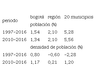 De acuerdo con la Tabla 2, la población de Bogotá en el periodo 1997-2016 creció de manera continua al 1,54% anual, mientras que la de los veinte municipios lo hizo al impresionante ritmo del 5,28% anual. En los últimos seis años del periodo, se aprecia una menor tasa de crecimiento poblacional en Bogotá; según el Departamento Administrativo Nacional de Estadística (dane) (2019), la ciudad es expulsora de población, lo que se debe, por un lado, al aumento sostenido de los precios de la vivienda en Bogotá, que ha obligado a los hogares de ingreso medio bajo y bajo a buscar vivienda en las afueras de la ciudad; y por otro, está el desplazamiento de los hogares con ingresos altos a municipios que tienen una oferta de vivienda con gran cantidad de amenidades ambientales y un precio mejor del que podrían encontrar en la ciudad, como, por ejemplo, la vivienda campestre (Amézquita et al., 2015; idom et al., 2018). La densidad de población creció en Bogotá en ambos periodos, pero la de las otras regiones descendió. Esto indica que la acción de las administraciones de las ciudades de la región fue incrementar el perímetro urbano, a una tasa del 7,5% anual, como modelo urbano. Es decir, se desarrolló un modelo de ciudad disperso, de manera que esta medida afectó todas las áreas rurales del sistema de ciudades y, con ello, los sistemas naturales.