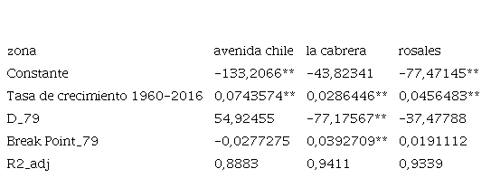 En la tabla, se tienen la constante, la tasa de crecimiento anual, el cambio en el intercepto derivado de un cambio en la pendiente en el periodo posterior a 1978 en las series (D_79; Break Point_79) y el R cuadrado ajustado para cada una de las zonas en análisis. En las restantes columnas se presentan los estimadores para cada zona. En primer lugar, los precios del suelo de Avenida Chile aumentan a una tasa del 7,4%, mientras que las zonas residenciales en consideración, La Cabrera y Rosales, lo hacen al 2,8% y 4,5% anual, respectivamente. En segundo lugar, en La Cabrera el cambio estructural, BP_79, sí es estadísticamente significativo, mientras que en las otras zonas no lo es. Esto significa que, en el último periodo, 1978-2016, los precios de este sector crecieron al 6,8% anual aproximadamente, dinámica cercana a la de la Avenida Chile. En general, las zonas residenciales tienen una tasa de incremento de los precios menor a la de la zona comercial-financiera. Como la correlación de las dos zonas residenciales es del 99% y la tasa de crecimiento de La Cabrera es más cercana a la de la Avenida Chile, se tomará esta última para el análisis propuesto. El análisis se centra en los precios de La Cabrera en asociación con Avenida Chile. Para probar las hipótesis de irrelevancia de la norma en los precios del suelo se estimó la siguiente ecuación: