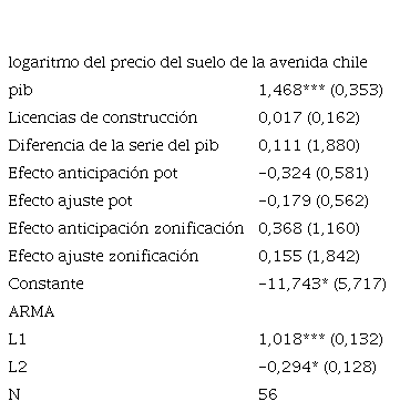 En el caso de la Avenida Chile, se corrieron las especificaciones de las ecuaciones (5) y (6). Las variables estadísticamente significativas son el pib y los componentes autorregresivos de orden 1 y 2. Se puede apreciar que un incremento del 10% en el pib genera un incremento de los precios de este suelo en 14,7%. La suma de los coeficientes de los términos autorregresivos –es decir, la velocidad de convergencia al equilibrio de largo plazo (0,724)– es menor que la de La Cabrera. Aquí el ajuste en el segundo periodo corresponde al del sexto periodo de La Cabrera. Las actividades comerciales necesitan un ajuste rápido, mientras que los agentes residenciales tienen un mayor tiempo de espera. Es importante resaltar que en los modelos presentados en la Tabla 4 y Tabla 5, las normas (upz y pot) tienen un efecto nulo sobre los precios del suelo.