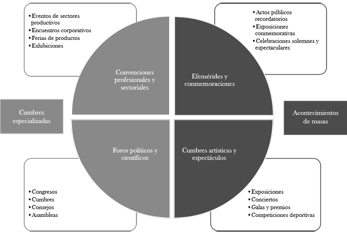 En la bibliografía abundan las tipologías de eventos, las cuales toman distintos criterios de clasificación (escala territorial, periodicidad, temática, equipamientos, objetivos y costes) (Paül i Agustí, 2013; Richards & Ruiz, 2017). La más citada es la propuesta por Getz (2012, 2013), que los clasifica temáticamente en seis tipos: celebraciones culturales, foros de negocios y comercio, encuentros artísticos y de entretenimiento, competiciones deportivas y recreativas, cumbres políticas y de estado y eventos privados. Siguiendo el esquema diseñado por este autor, presentamos una taxonomía que trata de perfilar con mayor precisión este fenómeno para el estudio de caso. Tal como se puede apreciar en la Figura 1, el criterio central por el que hemos optado para establecer la clasificación es el tipo de asistente que participa en los mismos.