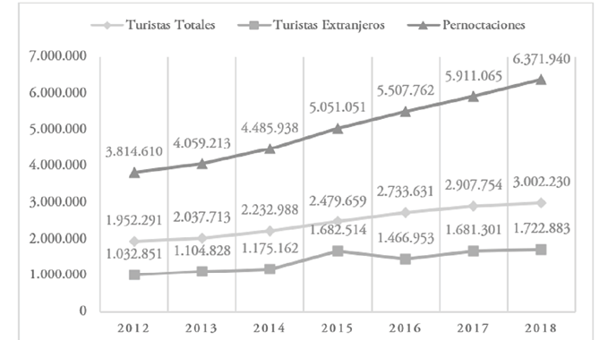 Sevilla es una ciudad media, cuya población alcanza los 700.000 habitantes y cuya área metropolitana supera con creces el millón de vecinos. En esta urbe, la actividad turística constituye una de las principales bases económicas. De hecho, la tradición turística viene de antiguo, ya que las primeras guías de viajes y las operaciones urbanísticas dirigidas a crear atmósferas atractivas cargadas de exotismo romántico para los viajeros se remontan a finales del siglo xix. Esta especialización ha convertido a Sevilla en una de las más destacadas ciudades turísticas del Estado español. Lo anterior se constata en la Figura 2, donde se aprecia la tendencia ascendente experimentada en los últimos años.