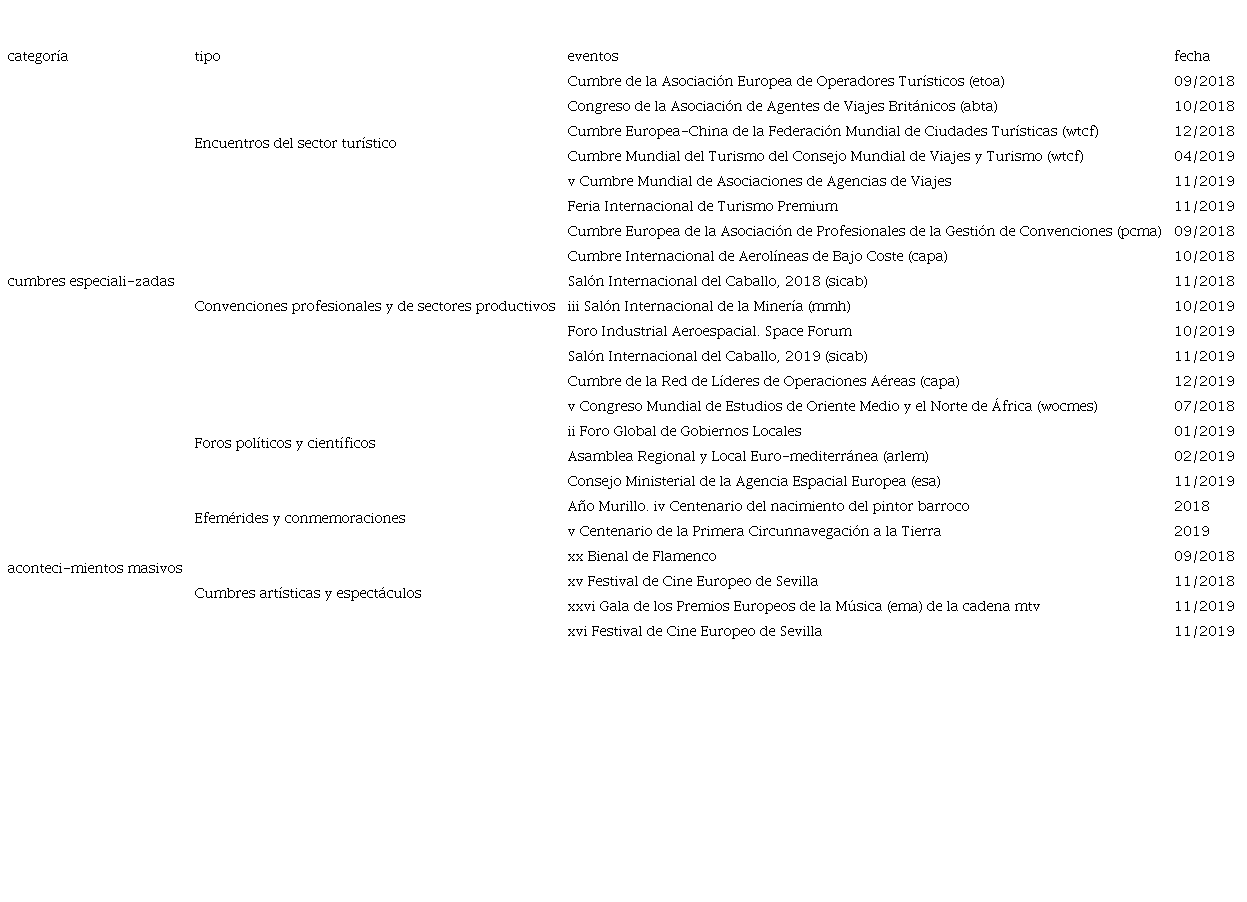 En su firme apuesta por estar presente en el candelero mediático, la administración sevillana se ha embarcado en una estrategia de organización incesante de fastos, que exige de una planificación y una programación muy estudiadas y que tiene como horizonte temporal el corto periodo de una o dos legislaturas. En la Tabla 2 se muestran los acontecimientos internacionales celebrados entre 2018 y 2019, clasificados según la tipología propuesta en la Figura 1. Como se puede apreciar, el número, la relevancia internacional, la diversidad temática y la sucesión de los eventos revelan la especialización de la ciudad en la producción en serie de acontecimientos mediáticos.