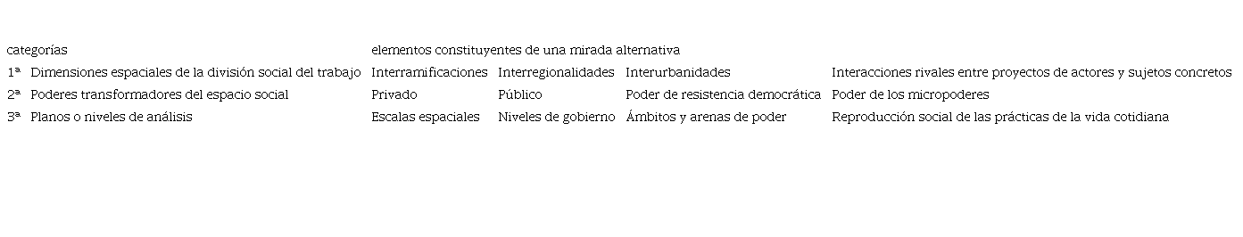Enseguida, como parte de la propuesta de este artículo, presentamos el esquema teórico contenido en la Tabla 1, donde se despliegan tres categorías –división social del trabajo, poderes transformadores del espacio social y planos/niveles analíticos–, cada una de ellas con cuatro elementos constituyentes.