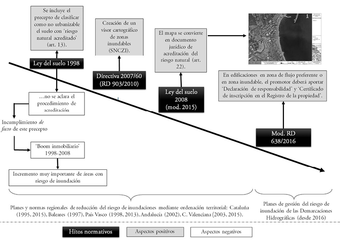 Ante la falta de una ley marco sobre riesgos naturales en España, la legislación de agua, mediante la adaptación de la Directiva 2007/60/ce relativa a la evaluación y gestión del riesgo de inundación, y la Ley 17/2005, de 9 de julio, del Sistema Nacional de Protección Civil, constituyen las referencias básicas para abordar el tratamiento del riesgo de inundación. Ambas normativas consideran la cartografía de riesgos como un elemento fundamental para identificar las áreas geográficas susceptibles y diseñar políticas públicas coherentes. Pero es la Ley de Suelo de 2008 (Real Decreto Legislativo 2/2008, de 20 de junio, por el que se aprueba el texto refundido de la Ley de Suelo), revisada en 2015 por el Real Decreto Legislativo 7/2015, de 30 de octubre, por el que se aprueba el texto refundido de la Ley de Suelo y Rehabilitación Urbana, la que establece que el documento de acreditación del riesgo natural es el mapa y lo vincula con los instrumentos de ordenación territorial (Olcina, 2017).