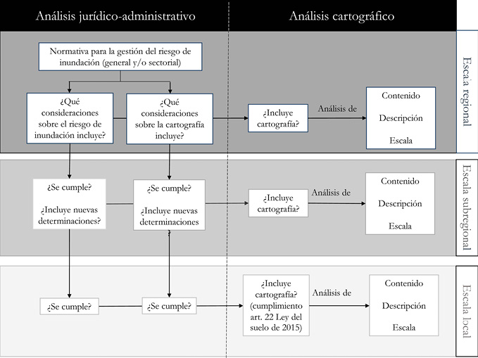 En este trabajo, se plantea en primer lugar un análisis jurídico-territorial de la cartografía de inundaciones a escala regional. Se trata de comprobar si existen planes o especificaciones normativas para reducir el riesgo de inundaciones y, en su caso, analizar el tratamiento y las determinaciones sobre el riesgo y la cartografía que contienen para las escalas menores derivadas, y si estas se cumplen o no. En el caso de los planes generales de ordenación urbana (pgou), se comprueba el grado de cumplimiento del ya referido artículo 22 de la Ley de Suelo de 2015.