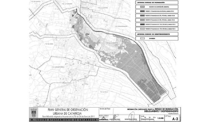 Entre los pgou analizados destaca la heterogeneidad en el tratamiento del riesgo. El artículo 22 de la Ley de Suelo estatal tiene una redacción de interpretación amplia, cuya adaptación presumiblemente tendrá que ser concretada en las comunidades autónomas. Se observa, incluso dentro de una misma región, diversidad de tratamiento de esta cuestión, tanto en los documentos escritos del pgou como en la cartografía. En el caso de la Comunidad Valenciana, para la elaboración de los planes se utiliza la información cartográfica contenida en el Sistema de Información Territorial y no se incluye el tratamiento de todos los peligros naturales existentes, a pesar de existir una base cartográfica oficial. En la mayoría de los casos analizados, la referencia al riesgo de inundaciones y la incorporación de la cartografía oficial del patricova se realiza de oficio. Debe indicarse que entre los informes que debe incluir el plan estructural que compone un documento de planificación urbana municipal, el informe de inundabilidad es de obligada incorporación, según el artículo 34 de la ya citada ley valenciana de ordenación del territorio de 2014, actualizada en 2019 (Ley 1/2019, de 5 de febrero, de modificación de la Ley 5/2014, de 25 de julio, de Ordenación del Territorio, Urbanismo y Paisaje de la Comunitat Valenciana). Esta información, además, forma parte de la Infraestructura Verde de la Comunidad Valenciana, según señala el artículo 5 de la mencionada ley. Sería necesario que la Conselleria de Territorio, competente en esta materia, estableciese una directriz clara, con indicación precisa de los informes y mapas necesarios para cumplir el artículo 22 de la Ley de Suelo estatal, y obligara a ajustar la escala de trabajo de estos mapas para que no se convirtiera, como ocurre, en una adaptación de la cartografía oficial del patricova, sin incluir trabajo de campo de comprobación y ajuste. Como muestra el ejemplo de la Figura 3, la cartografía utilizada en el pgou es una trasposición a escala 1:25.000, de la cartografía del patricova de este municipio.