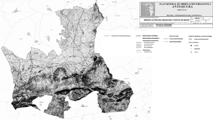 La mitad de los planes analizados no incluye cartografía del riesgo de inundación, y los que si la incluyen presentan una gran heterogeneidad en cuanto a la conceptualización, la metodología y la representación cartografía del riesgo de inundación. Los documentos de planificación de escala local no cumplen, de forma general, con la obligación de incluir cartografía de riesgo de inundación. En el ejemplo de la Figura 4 se identifican las zonas inundables a través de puntos y no de polígonos. No se explica la metodología utilizada y el nivel de detalle es muy bajo.