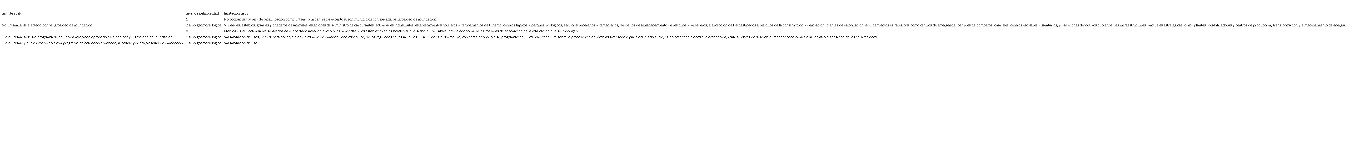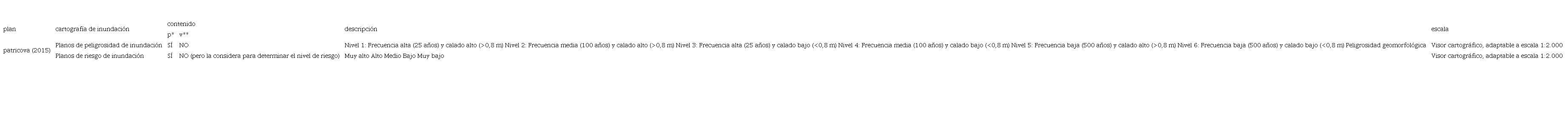 Si bien es cierto que el patricova no incluye cartografía de vulnerabilidad como tal, sí considera esta componente para determinar el riesgo de inundación. No obstante, en la normativa de patricova donde se establecen las limitaciones a los usos del suelo que deberán ser recogidos por los pgou, se remite al nivel de peligrosidad y no de riesgo (Tabla 2).