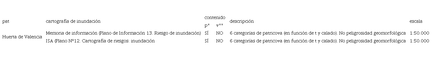 En el pat Huerta de Valencia el tratamiento del riesgo de inundación se ajusta a lo contenido en el patricova, excepto en lo referido a la peligrosidad por criterios geomorfológicos, y se acompaña de la cartografía existente de dicho Plan, incluida en el Sistema de Información Territorial de la Comunidad Valenciana a escala 1:50.000.