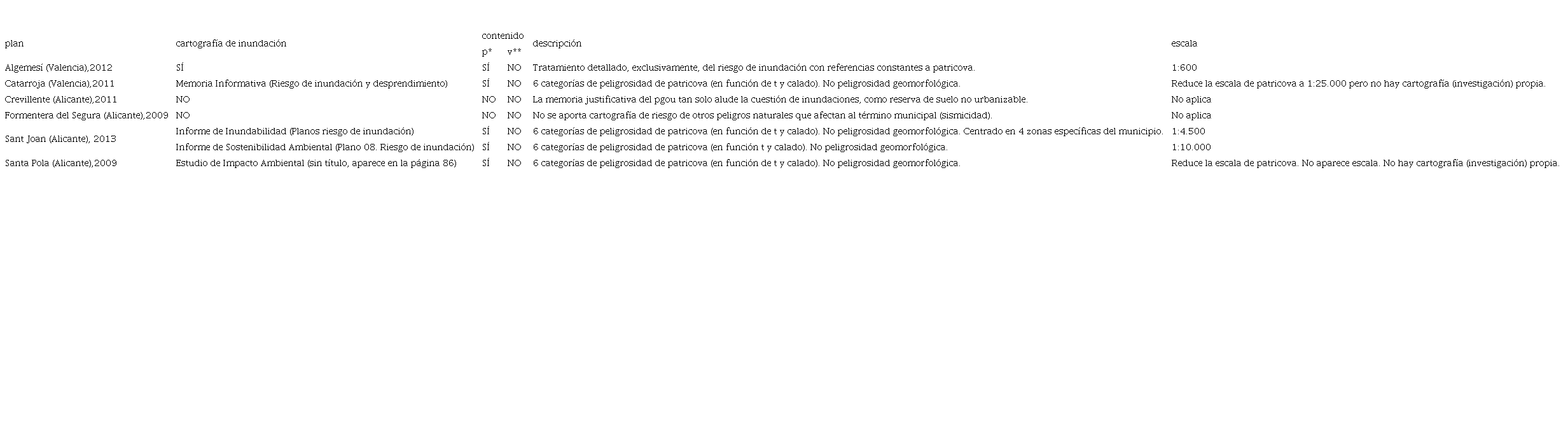 De los 542 municipios de la Comunidad Valenciana, solo 46 han llevado a cabo procesos de revisión y aprobación de su pgou (hasta finales de 2019): siete de la provincia de Alicante, quince de Valencia y veinticuatro de Castellón. Se trata, principalmente, de municipios pequeños de interior, sin grandes problemas derivados de la peligrosidad natural. Para el análisis se han seleccionado seis municipios que destacan por su alto riesgo de inundación según patricova (2015) y que han aprobado su pgou después de 2008 (Tabla 4).