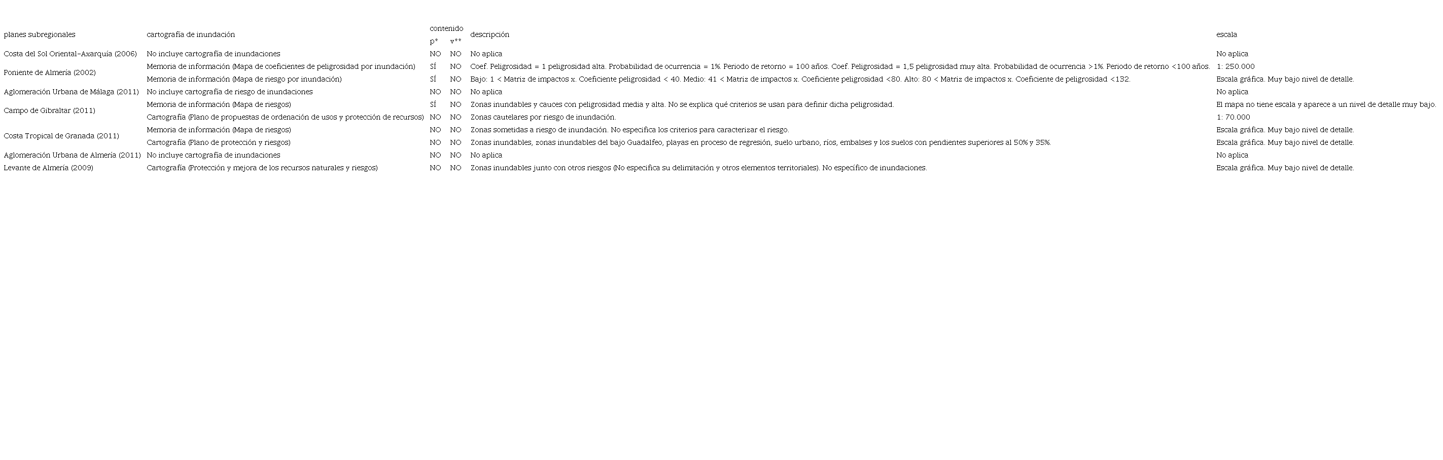 En Andalucía existen veintidós Planes Subregionales, de los cuales diecisiete han sido aprobados. De ellos, se han analizado aquellos siete pertenecientes al litoral mediterráneo. Todos consideran el riesgo de inundación como el de mayor afección en sus ámbitos de actuación. De manera más explícita se realiza esta identificación en los Planes Subregionales aprobados de 2009 en adelante, en los que, bajo diferentes denominaciones, la memoria de información dedica un apartado o capítulo específico a la consideración del riesgo. En todos ellos, además, se define la doble consideración del riesgo como fenómeno natural potenciado por las actividades humanas y la urbanización (Tabla 5).