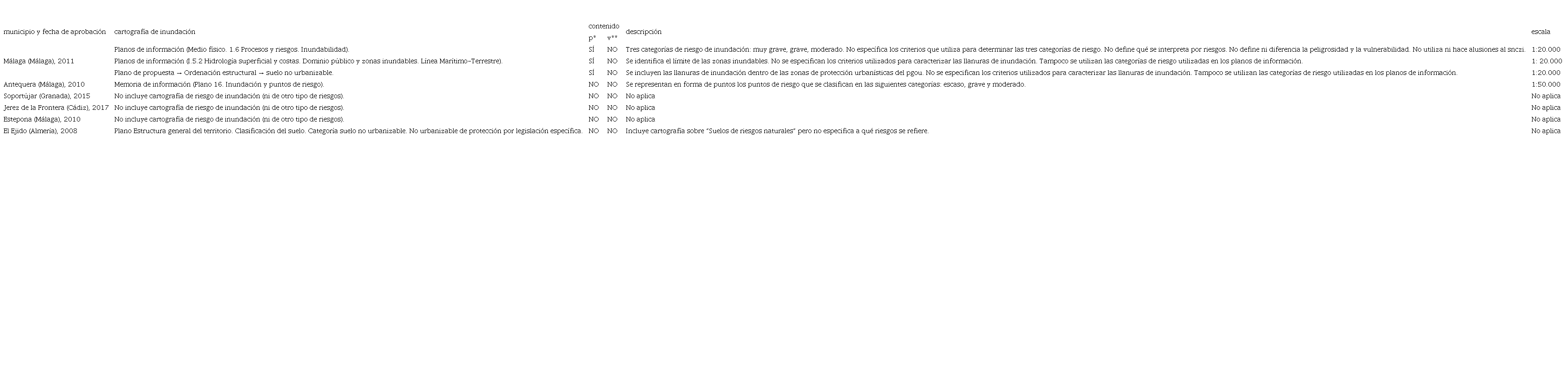 Después, se realiza un análisis cartográfico para valorar la calidad de los mapas de riesgo de inundación. Para ello, se ha realizado una sistematización de este análisis cartográfico de los instrumentos de planificación a partir de los siguientes criterios: