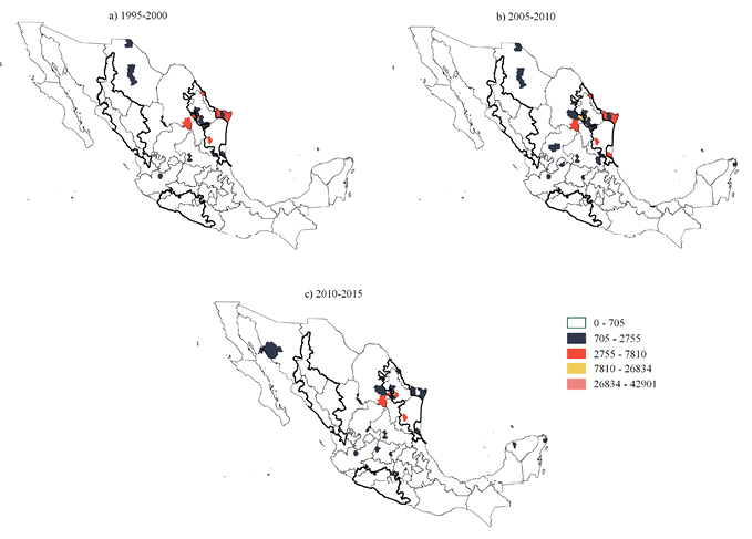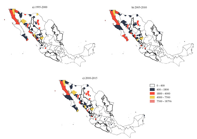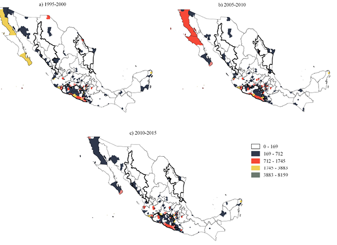 Como se observa en la Figura 3, las regiones asociadas con altas tasas de homicidios y emigración, además de bajas tasas de inmigración, para los tres periodos analizados se localizan particularmente en el Triángulo Dorado ampliado, que comprende municipios serranos de Chihuahua, Durango, Sinaloa y Sonora, y una segunda región en Tierra Caliente ampliada, en las entidades de Michoacán y Guerrero, además de municipios vecinos del Estado de México y Jalisco. Para el periodo 1995-2000, y en menor medida para el periodo 2005-2010, también se observó una región con características similares en municipios costeros de Oaxaca y Guerrero, la cual dejó de ser significativa en el periodo 2010-2015. Este fue un caso contrario al de la región comprendida por municipios de la frontera noreste de Nuevo León y Tamaulipas, que no mostró altas tasas de violencia asociadas a altas tasas de emigración y bajas tasas de inmigración interna sino hasta el periodo 2005-2010, situación que para el periodo 2010-2015 se extendió a gran parte de los municipios del norte de Nuevo León y Tamaulipas.