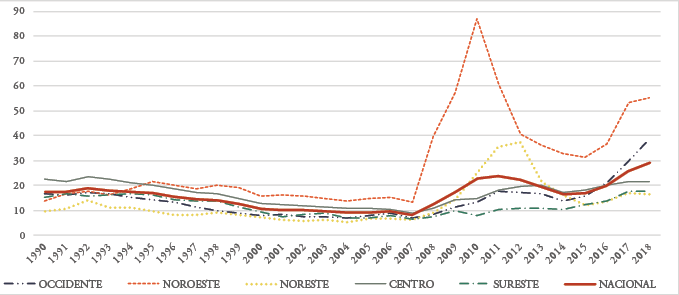 elaboración propia a partir de la regionalización del cns (2013) y los registros administrativos del inegi (2020)El incremento de la violencia a partir de 2007 no se dio de manera generalizada en todo el territorio nacional. Según lo muestran los registros de homicidios del inegi (2020), las regiones del país con los mayores incrementos en sus tasas fueron las zonas noroeste y noreste de México, donde la primera llegó a registrar 87,2 homicidios por cada 100 mil habitantes en 2010, mientras que la región noreste tuvo su mayor tasa en 2012, con un nivel de 37,5 homicidios por cada 100 mil habitantes. A nivel nacional, la mayor tasa se había dado en 2011 con un nivel de 23,6, cifra que fue superada en 2017 y 2018 por el incremento de la violencia en las zonas noroeste y occidente (Figura 1).